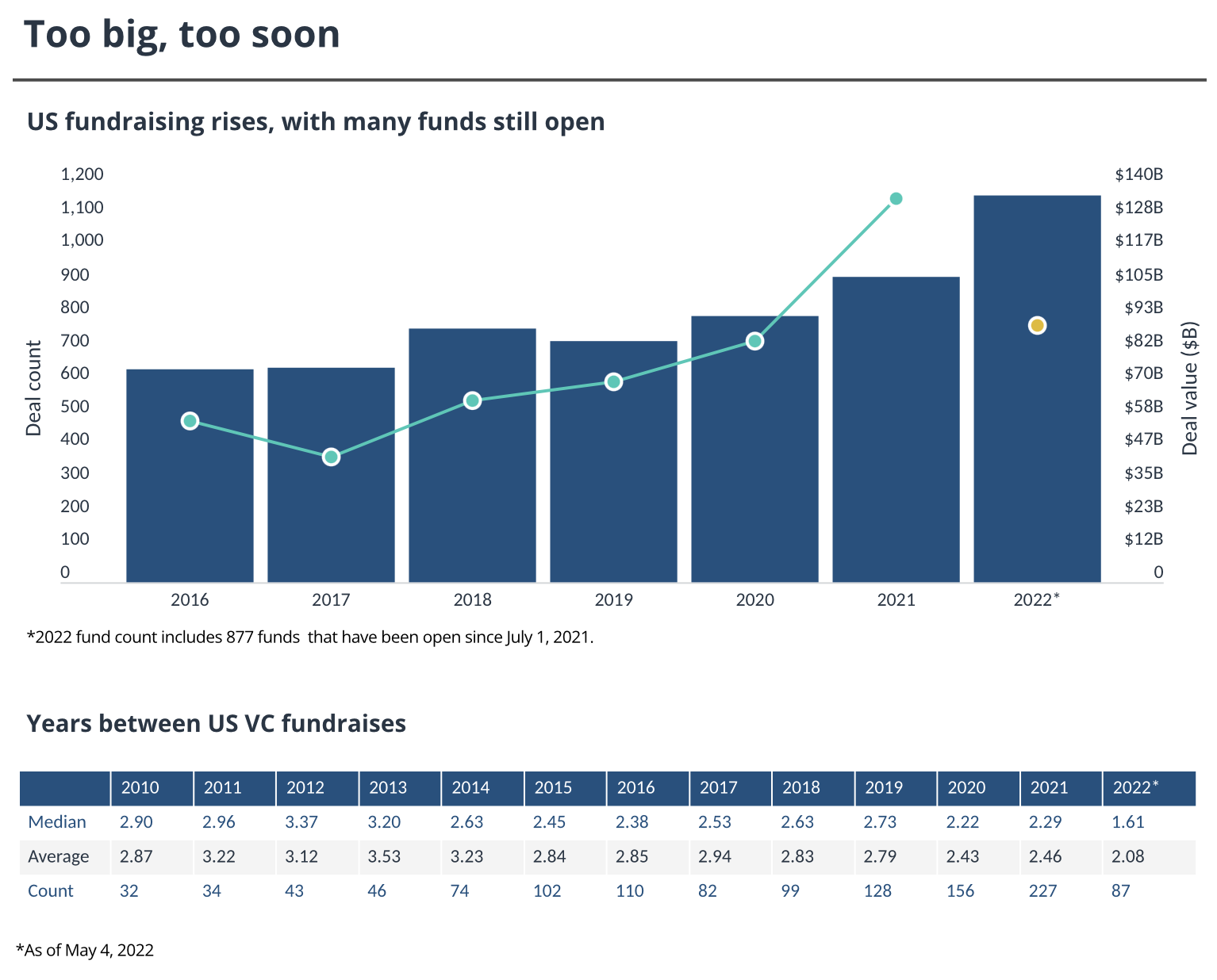 In 2022, VCs raised a grand total of $162.6 billion across 769 funds in fresh capital. That followed 2021’s own venture fundraising record of $154.1 billion. As of Sep 30, 2022, there was about $298.5 billion of dry powder. — PitchBook.